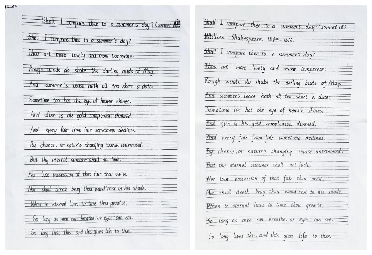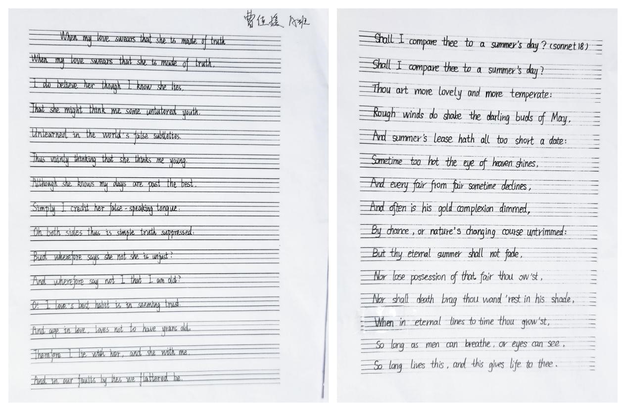 在英语教学方面,支教团小老师们围绕听、说、读、写、赏、演等方面开展丰富活动,其中重点开展英语书法比赛。英语与书法携手,文化与美学相遇。活动蕴含实用的英语知识和练习方法、引导学生养成良好的书写习惯并激发同学们练习书法的积极性,不仅帮助同学们认识到英语书法练习的重要性,也为以后的英语学习奠定良好的学习基础,还让同学们感受到了英语的魅力,了解多元文化,提升文化素养。