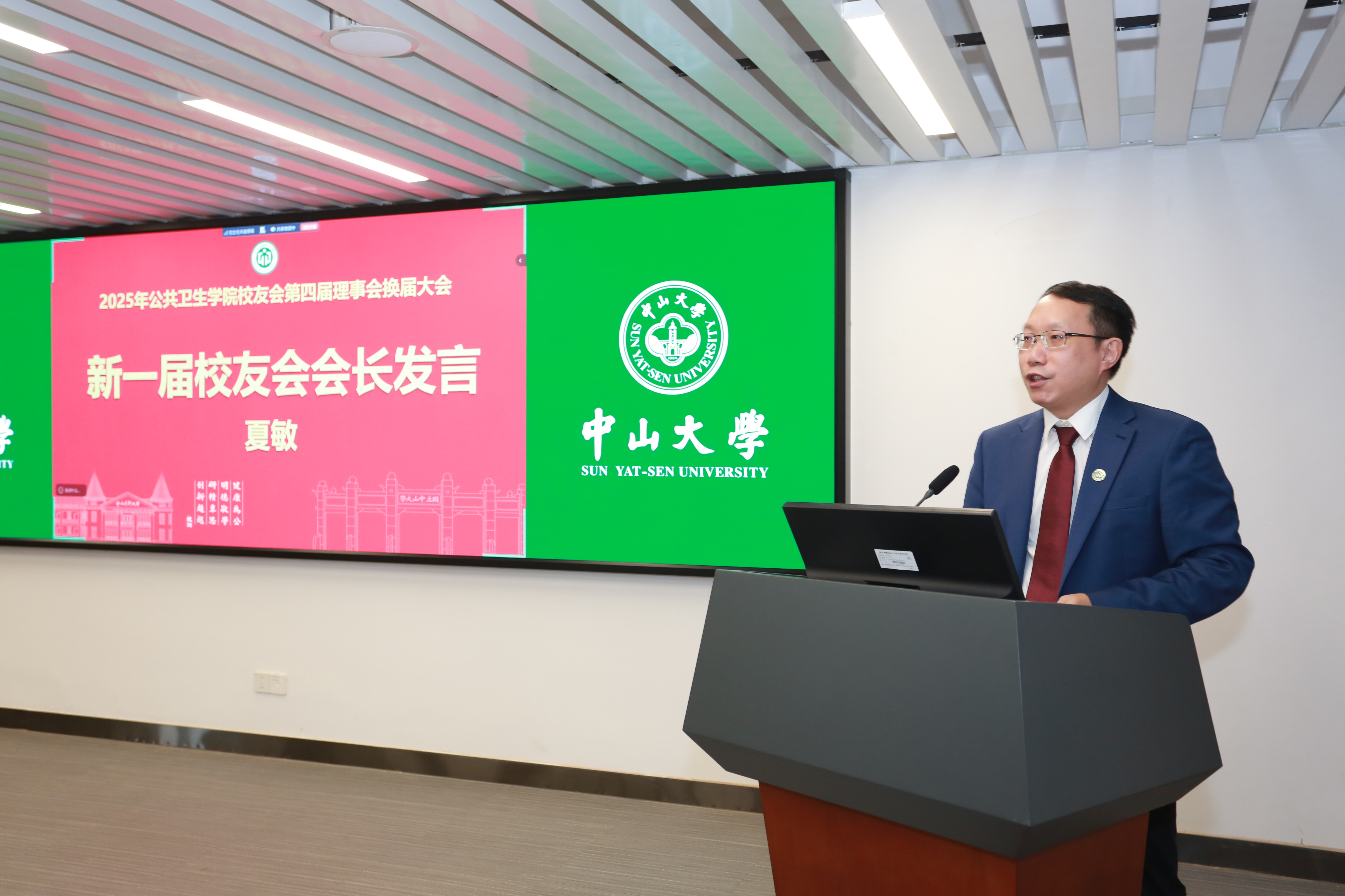 新一届校友会常务副会长刘汉江先生、校友会会长夏敏教授、校友会顾问代表方积乾教授先后发表讲话,他们表示新一届理事会将进一步加强校友间的联络与互助,搭建更多交流合作平台。尤其在学院建院 50 周年即将到来之际,将全力联动各方,精心筹备系列庆典活动,让全球公卫校友凝心聚力,共同为学院的高质量发展注入源源不断的动力。