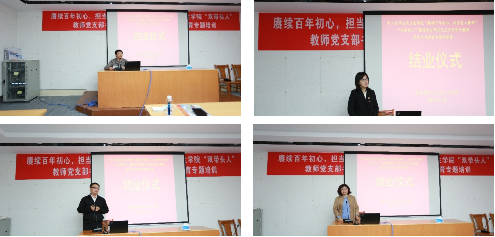 班长王冬亮教授代表全班同学发表结业感言,韦艳宏教授(右上)、林华亮教授(左下)以及李秀红教授分别代表第一、二、三组学员发言