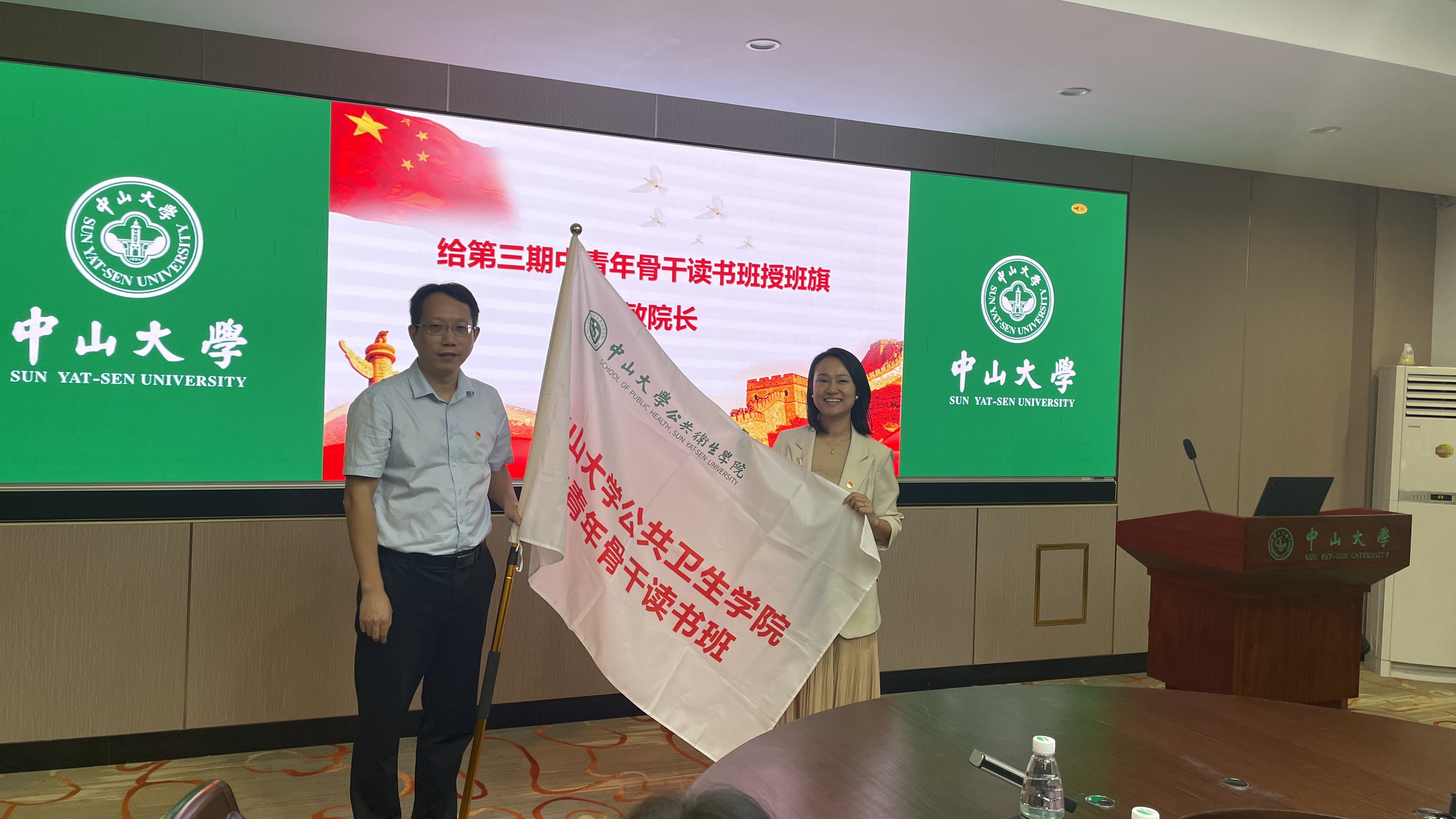 学院夏敏院长代表学院给第三期中青年教师骨干读书班授班旗。读书班班长廖婧副教授接旗。