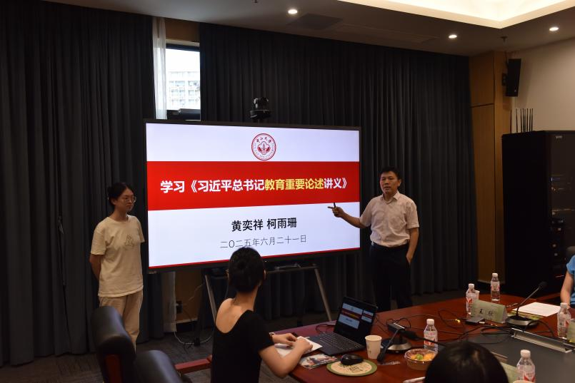 学院党委委员、教师党支部书记、系主任黄奕祥教授和系研究生党支部书记柯雨珊以“八项规定强作风,以上率下促成长”为主题讲授党课,阐释“教师是立教之本、兴教之源”的核心要义,号召师生勇于批评与自我批评,践行“三严三实”。