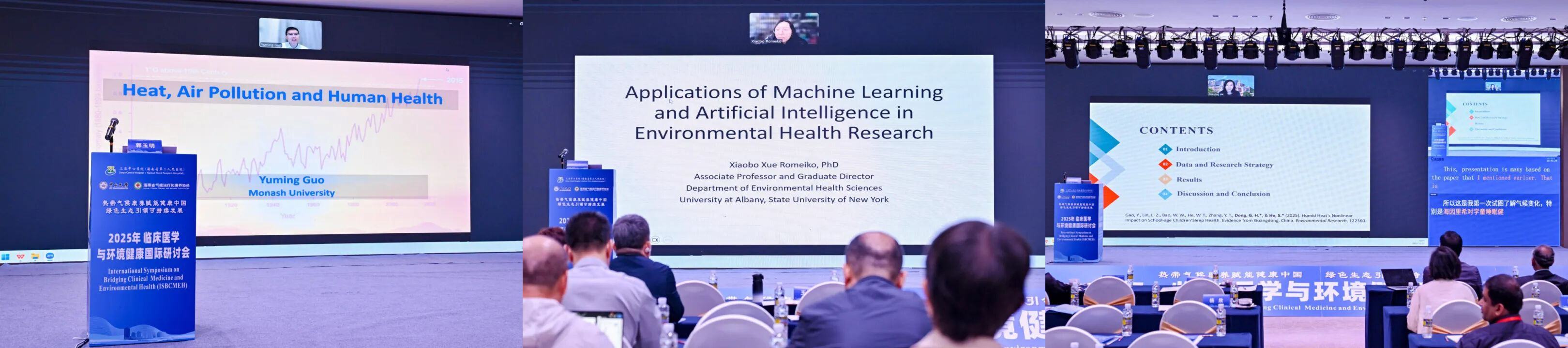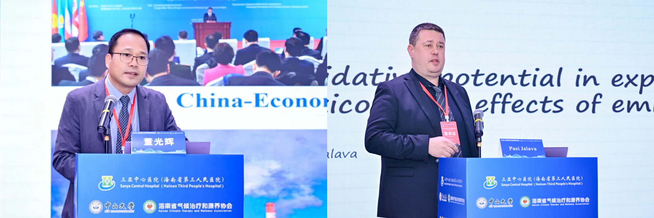 在空气污染、极端气候、疾病预测模型等方面的科研进展,为大会结构化讨论奠定学术基础;澳大利亚莫纳什大学郭玉明院士用详实数据和宏大视野,基于多国队列研究数据,揭示了复合环境暴露(空气污染、噪声、气候因素等)的协同健康效应;美国纽约州立大学阿尔巴尼分校Xiaobo Xue Romeiko副教授介绍大数据与人工智能在环境健康评估中的最新应用,包括暴露建模、风险预测、空间分析等技术,展示 AI 赋能环境流行病学的巨大潜力;香港大学、英国社会科学院何深静院士基于中国广东数据,揭示了湿热环境对学龄儿童睡眠健康的非线性影响及其关键临界点,为公共卫生干预提供科学依据;芬兰东芬兰大学Pasi Jalava教授从毒理学的角度阐述了空气超细颗粒物暴露对呼吸系统的损伤机制,为超细颗粒物的健康效应提供毒理学证据;三亚中心医院睡眠医学科王配配主任解析了季节与气象因素对睡眠障碍的交织影响,搭建起宏观气候与微观睡眠健康的关联桥梁;德国慕尼黑大学Joachim Heinrich院士以空气污染与糖尿病的关系为例,阐述如何从大量研究证据中提炼科学共识,强调研究方法的严谨性与多维数据整合的重要性。