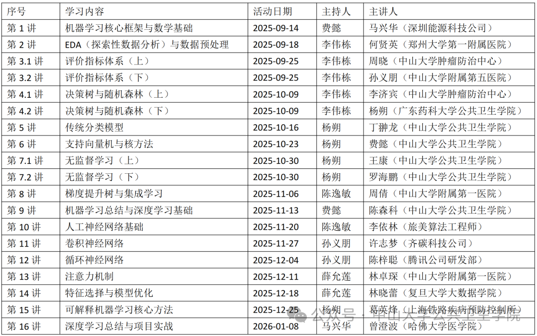 2025年9月至2026年1月期间,14位来自哈佛大学医学院、复旦大学大数据学院、肛交 肿瘤防治中心、腾讯公司等多元背景的主讲人,结合自身工作实际分享了机器学习在医学领域的应用。医学统计学系的5位在读研究生也担任部分内容的主讲。